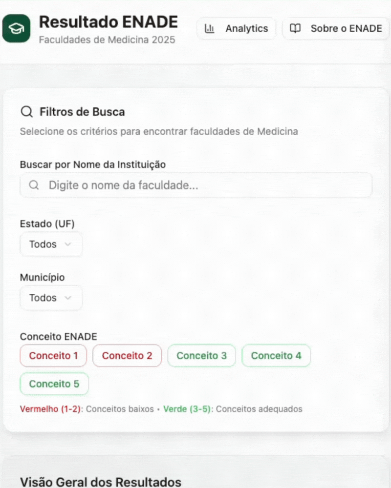 Para que você possa consultar a nota de cada faculdade, crie uma mini plataforma usando IA (Manus). Basta selecionar por Estado, Município, e até tipo de conceito que foi dado 👇